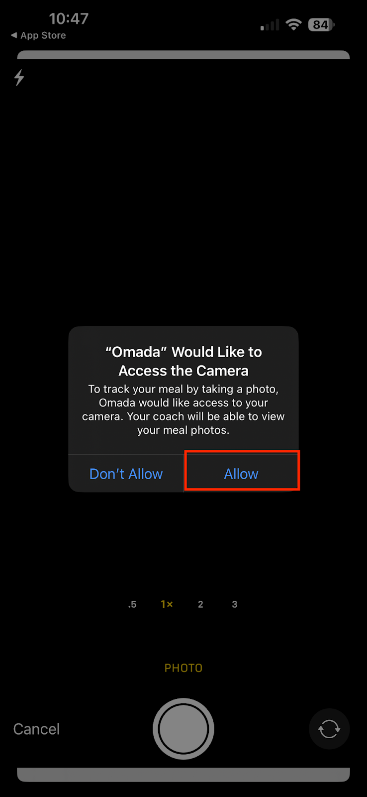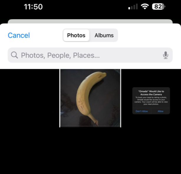 - Take a photo of your meal. Please note: If it’s your first time using the meal photo feature, you may see a pop up asking for permission to access your camera. Tap Allow.