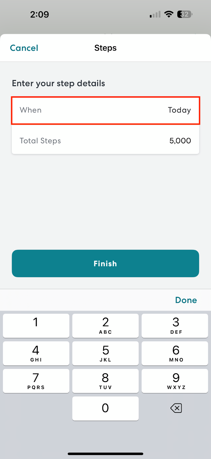 - You will see the word Today to enter your current day’s steps. If you need to enter activity for a previous date, tap Today and this will allow you to select a previous date. Please note you will not be able to enter activities for a future date.