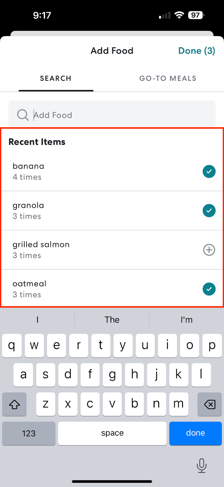 - Tap on a previously entered meal(s) under Recent Items.